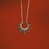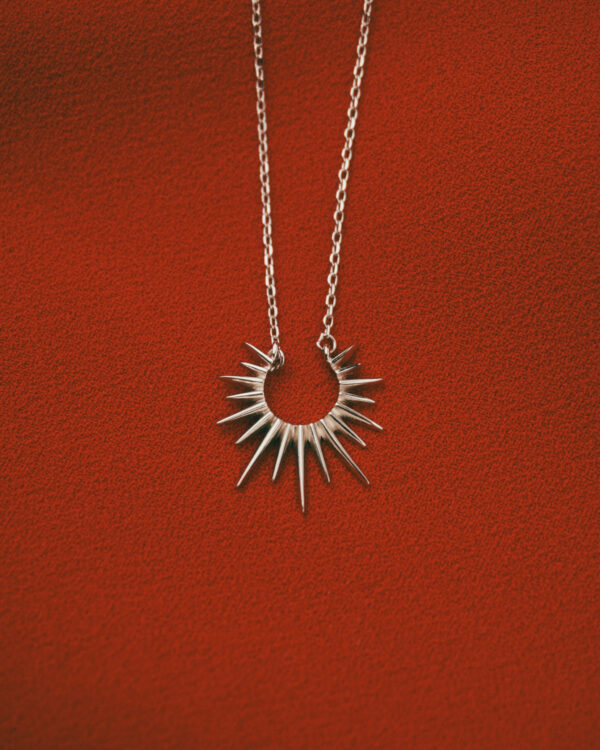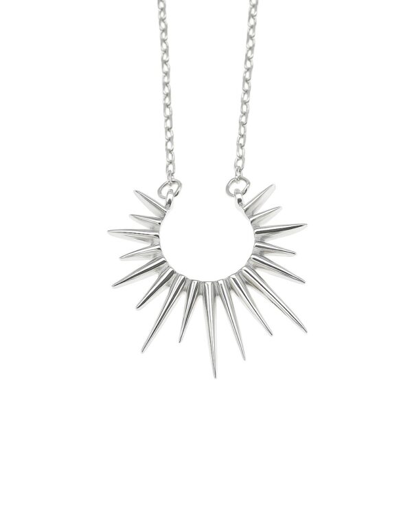 This silver necklace features a unique spiked design, perfect for those who love bold jewelry. Ideal for those looking to make a fashion statement, this necklace pairs well with both casual and evening wear, adding an element of power and sophistication to any outfit.