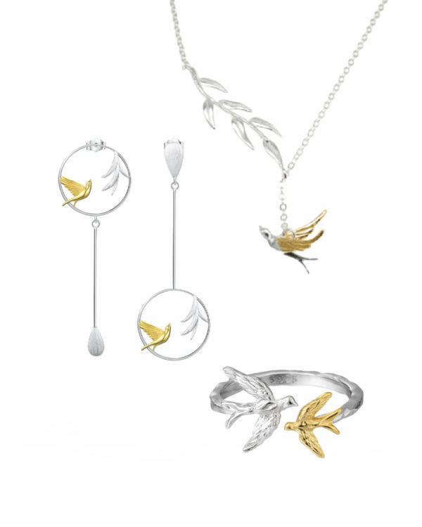 This set combines stunning elements of birds and leaves, blending the beauty of nature with elegance. The set includes a pair of asymmetric silver earrings, each featuring a graceful bird nestled inside a round hoop, as well as an adjustable pendant with leaves and a gold-plated bird. The set also includes an adjustable ring that fits any finger size. Made from 925 silver, this set is the perfect combination of minimalist design and intricate details, making it suitable for both everyday wear and special occasions.